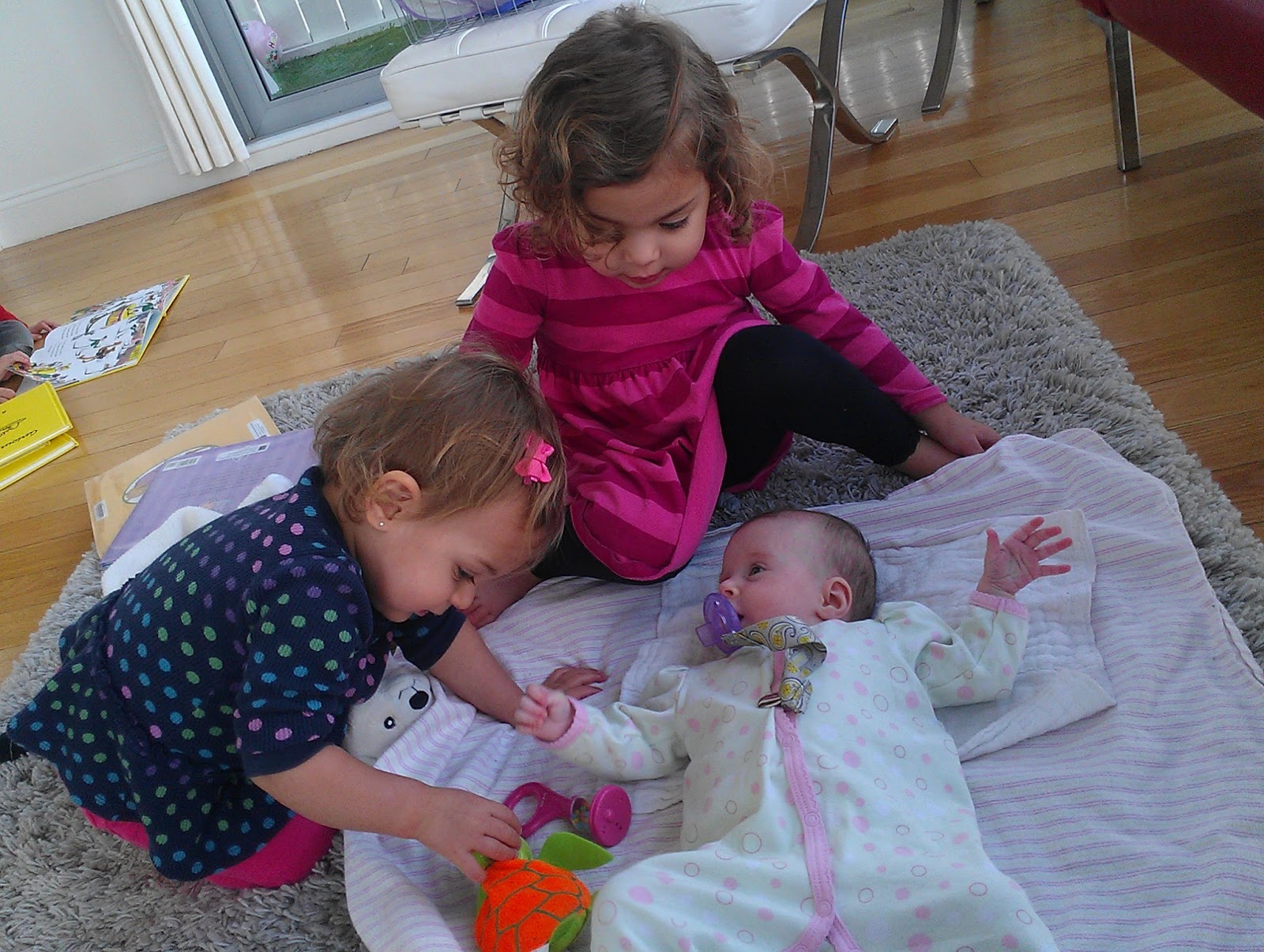 Now that Vivienne is three months old, she's much more alert and Aiyana and I are much more interested in her. We wanted to make sure she wasn't bored at a big-kid play date, so we brought her all of Aiyana's old baby toys. I don't know why, but she actually didn't play with them. She just sat there looking cute.
